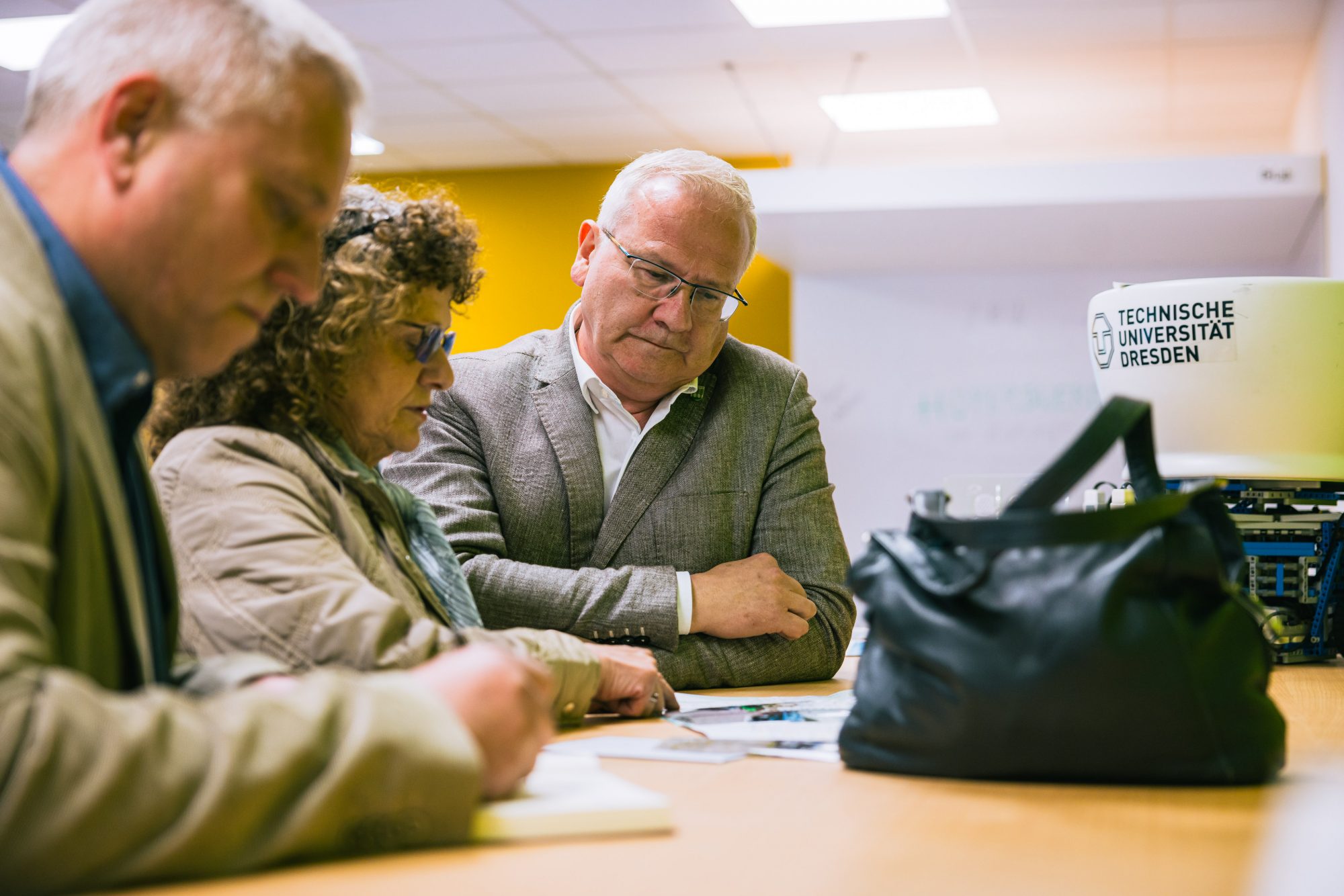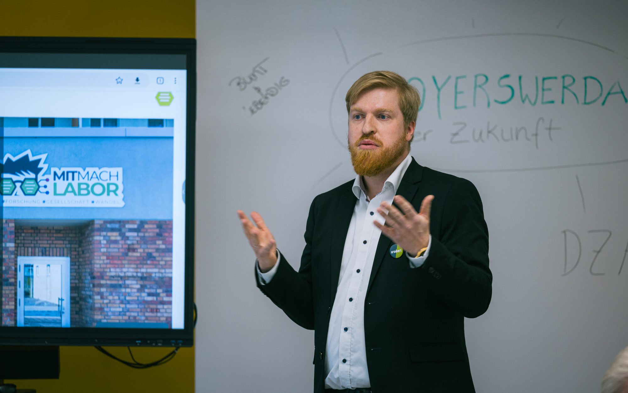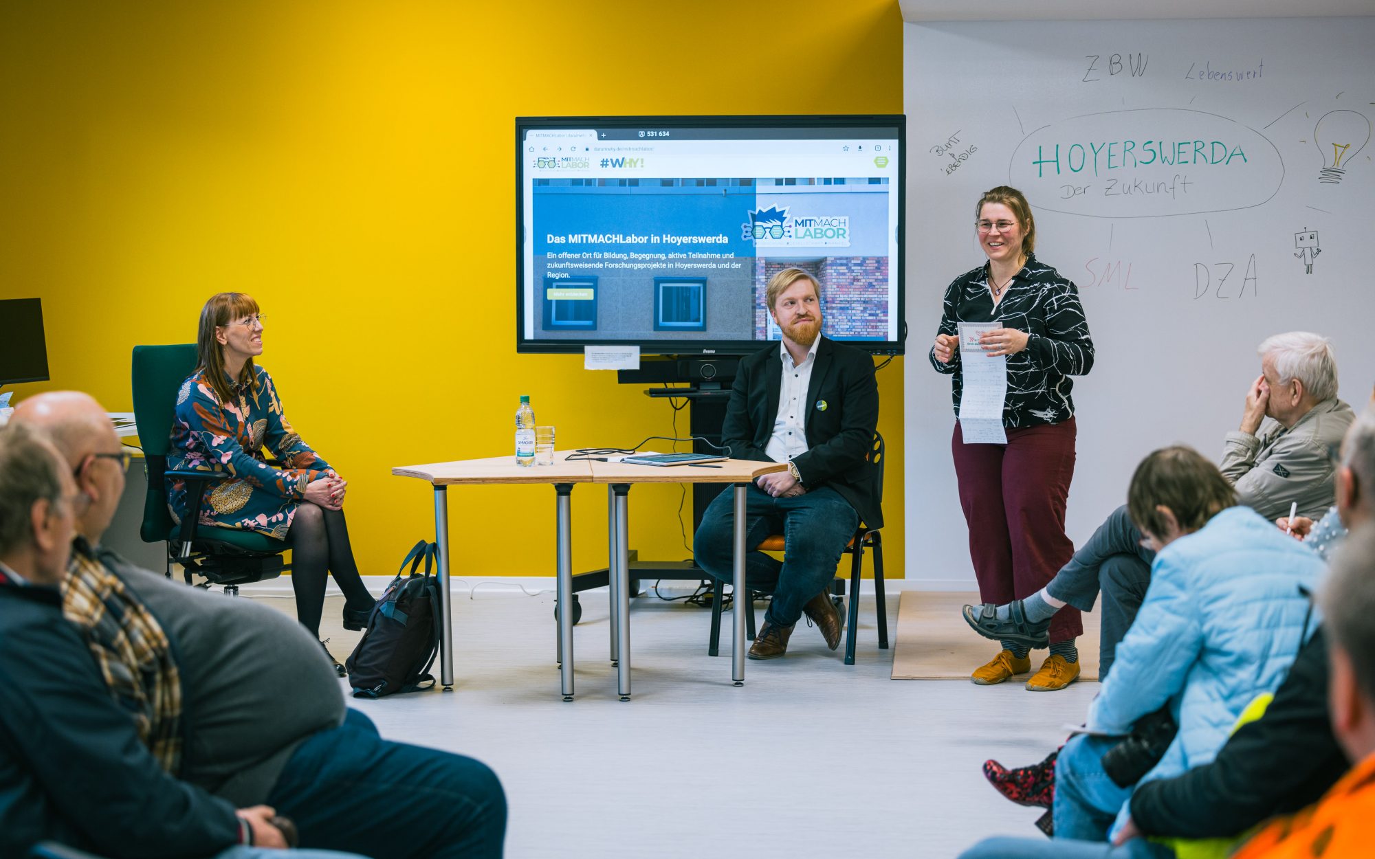 Sebastian Schindler, Koordinator des Mitmachlabors, stellt eines der drei wissenschaftlichen Strukturwandelprojekte unserer Region vor: das „Smart Mobility Lab“. Bis 2026 entsteht im Hoyerswerdaer Ortsteil Schwarkollm eine große Halle mit einem Fahrsimulator, der von der TU Dresden entwickelt wurde, in dem selbst fahrende Fahrzeuge getestet werden. „Wir werden die ersten sein, wo solche mobilen Gefährte herumfahren werden“, freut sich Oberbürgermeister Torsten Ruban-Zeh.