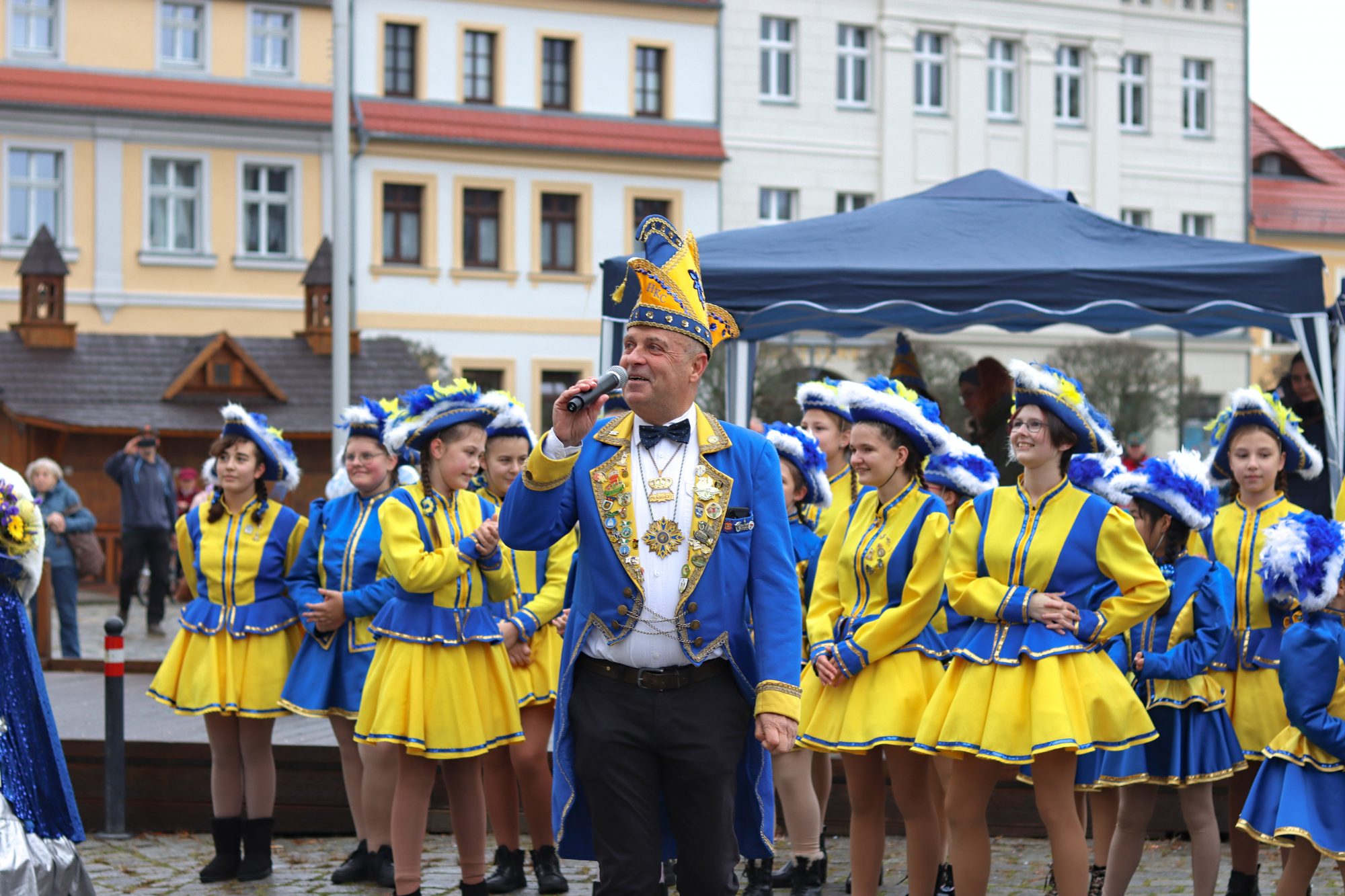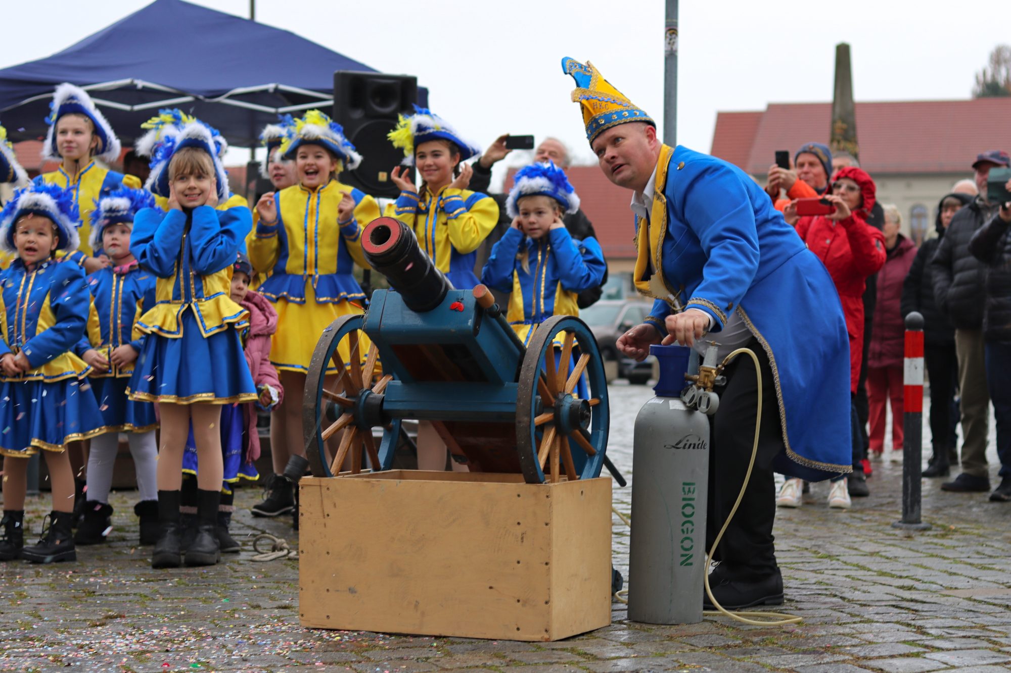 Fröhlich, bunt und musikalisch ging es am Vormittag des 11.11.2025 vor dem Alten Rathaus zu. Trotz Nieselregens hatten sich die Mitglieder des Hoyerswerdaer Karneval Clubs (HKC) auf dem Markt versammelt, um den Sturm auf die bürokratische Bastion vorzubereiten. Im Beisein der Funkengarde wurde pünktlich um 11:11 Uhr die Konfettikanone entzündet, das Zeichen für die Rathaus-Insassen, sich zu ergeben.