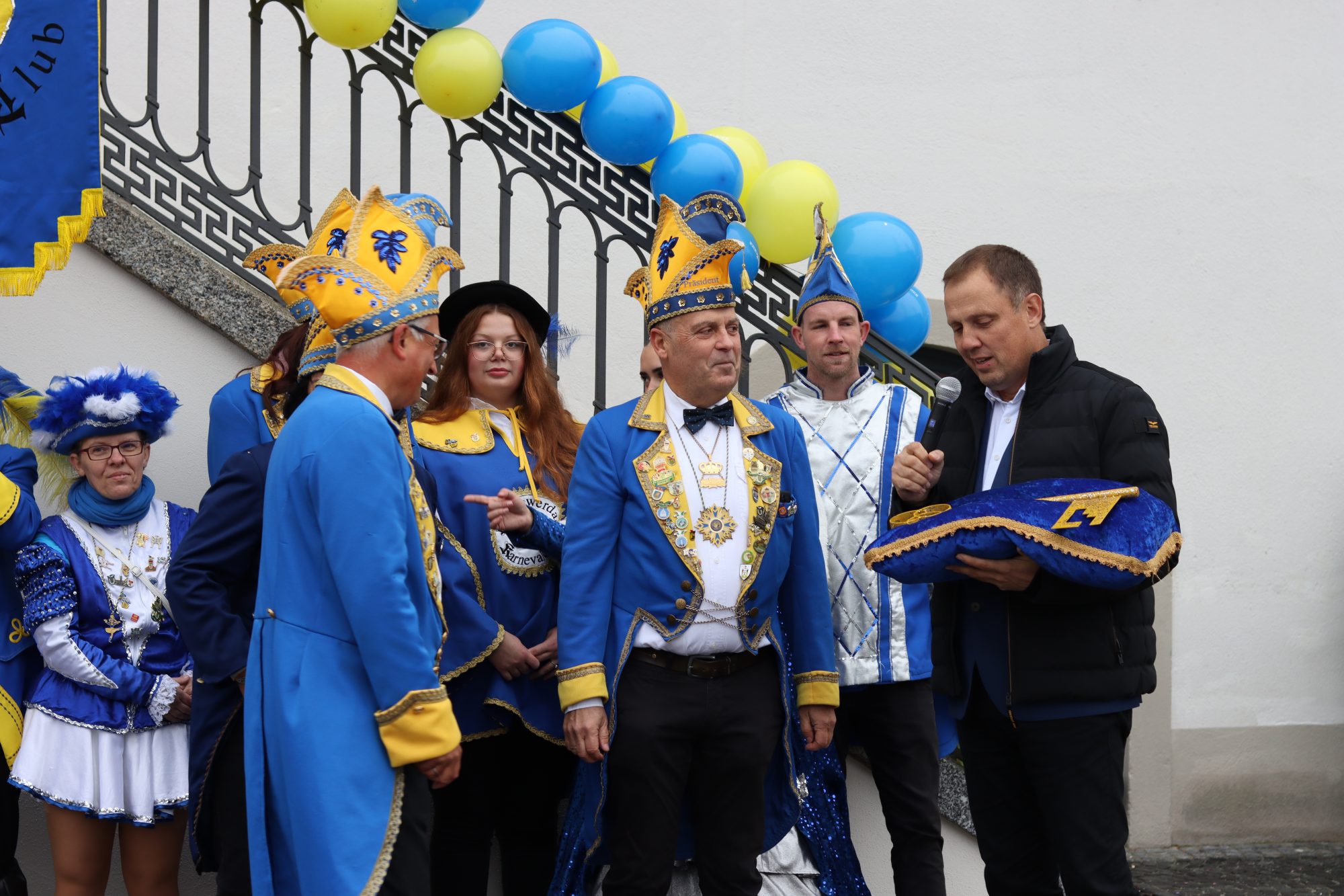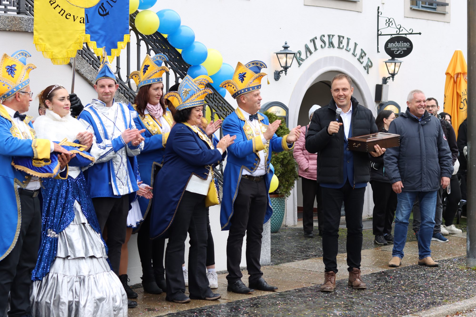 Bürgermeister Mirko Pink und Büroleiter Olaf Dominick hatten das Zeichen vernommen und bahnten sich den Weg nach draußen. Mit dabei hatten sie nicht nur den symbolischen Rathausschlüssel, sondern auch das Stadtsäckel gefüllt mit einigem raren Baren. Zum Dank für die monetäre Zuwendung gab es für den Bürgermeister und seinen Kompagnon einen Orden, darauf das Prinzenpaar Ayla I. und Toni I.
