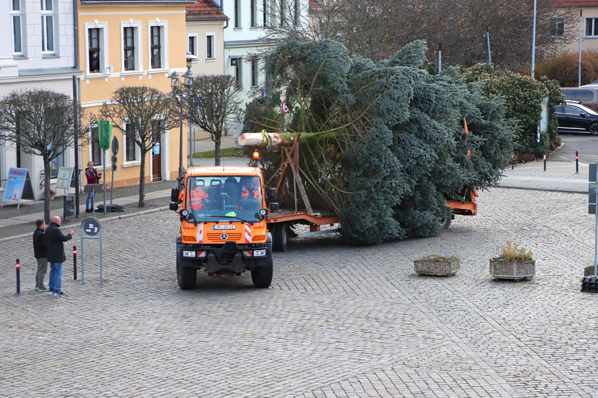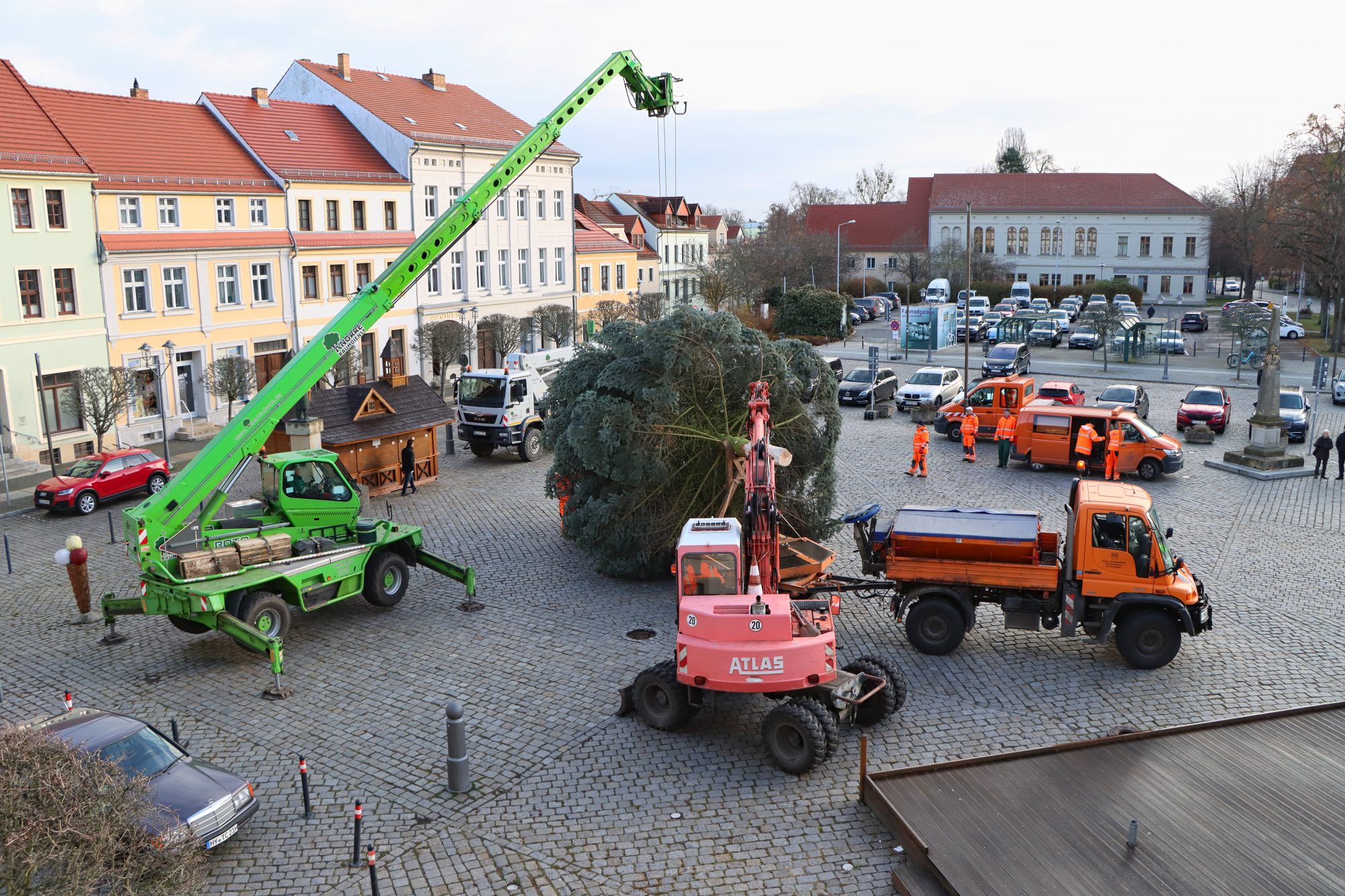 Am heutigen Dienstag, den 18.11.2025 fuhren unübersehbar die ersten weihnachtlichen Vorboten mit großer Gerätschaft auf dem Markt in der Altstadt bzw. dem Lausitzer Platz vor. Bei dem Weihnachtsbaum in der Altstadt handelt es sich um eine 10 Meter hohe Fichte aus privater Spende. Auf dem Lausitzer Platz in der Neustadt steht eine 10 Meter hohe Coloradotanne, die ebenfalls aus einer privaten Spende stammt. Die grünen Riesen wurden durch den städtischen Bauhof mit Unterstützung der Firma Knorre Baumdienst GmbH & Co. KG sowie des Polizeireviers Hoyerswerda transportiert und in jeweils rund einer Stunde aufgestellt.