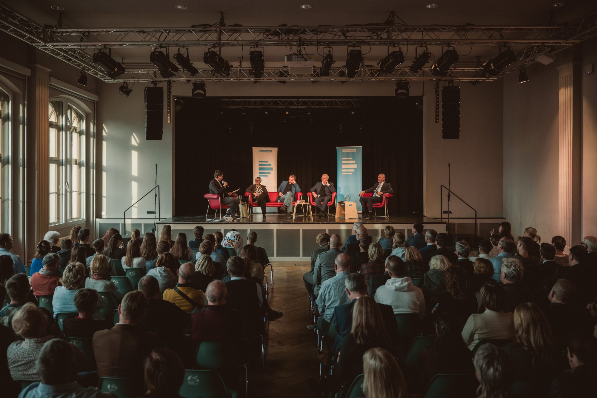 Um kurz nach 13 Uhr begann die Veranstaltung von Deutschlandradio, zu dem sich rund 100 Gäste eingefunden hatten. Den Auftakt bildete ein Interview mit dem Bundespräsidenten, die Fragen stellte Sina Fröhndrich. Danach diskutierten auf dem Podium der Soziologie Prof. Raj Kollmorgen, der CDU-Abgeordnete Marko Schiemann, Oberbürgermeister Torsten Ruban-Zeh und Cindy Paulick von der Regionalen Arbeitsstelle für Bildung, Demokratie und Lebensperspektiven (RAA) zu der Frage, wie Transformation in der Lausitz gelingt.