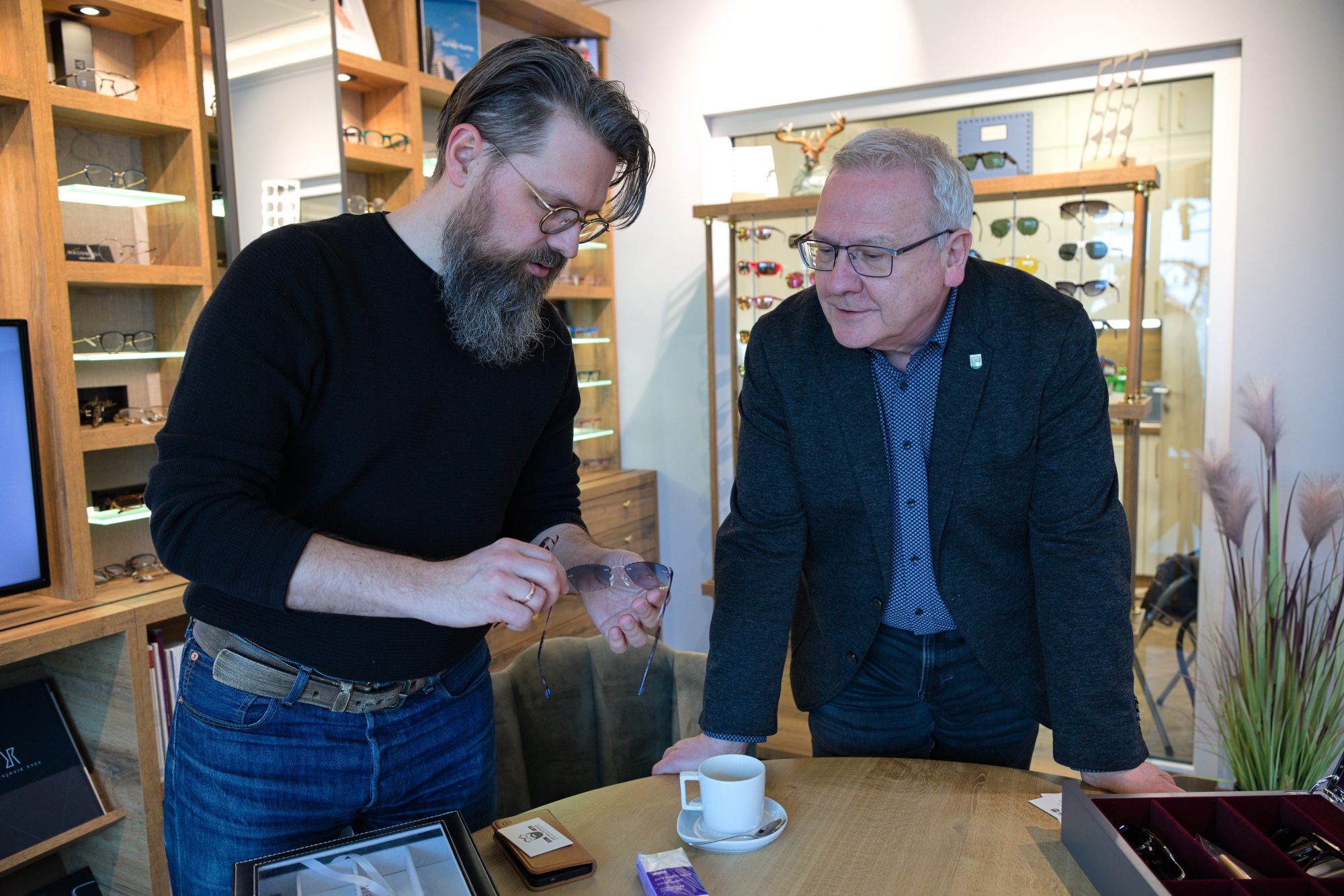 In welchem Land werden die hochwertigsten Brillen gefertigt? Was macht kleine Manufakturen so besonders? Und wer hat Brillen eigentlich cool gemacht? Zu diesen und anderen Themen erhielten Oberbürgermeister Torsten Ruban-Zeh und Christian Hoffmann, Leiter der Stabsstelle Wirtschaftsförderung, beim Unternehmensbesuch bei „Der Brillenträger“ am 09.03.2026 Antworten und Einblicke. Dort kamen sie mit Inhaber Matthias Jahny ins Gespräch.