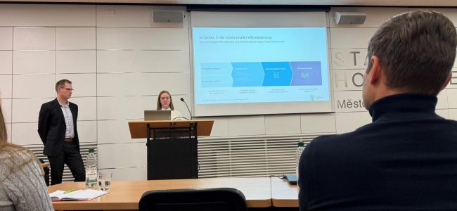 In einem Konferenzraum sitzen mehrere Personen auf Stühlen und verfolgen eine Präsentation. Auf einer großen Leinwand vorn ist eine Folie mit dem Titel „Mobilitätsstationen“ zu sehen, die sich mit multimodaler Mobilität beschäftigt. Zwei Vortragende – ein Mann mit Mikrofon und eine Frau – stehen vorn und sprechen. Die Atmosphäre ist konzentriert, das Licht fällt durch große Fenster in den Raum.