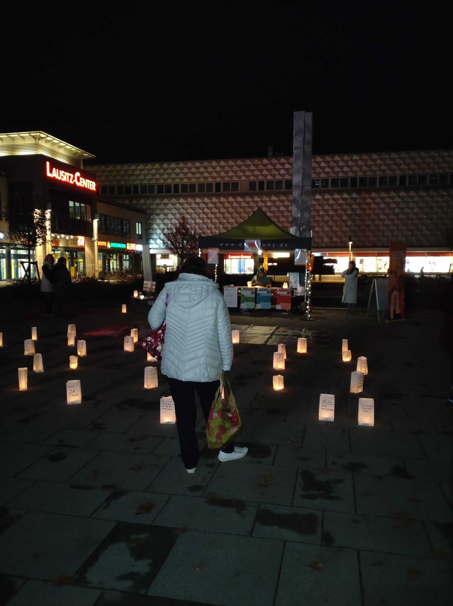 Auf dem Lausitzer Platz war am 13. November 2025 ein Aktions- und Infostand aufgebaut. Die Mitglieder des Arbeitskreises informierten hier zu Hilfs- und Beratungsangeboten und luden zum gemeinsamen Austausch und Zeichen setzen ein. Letzteres wurde mit kleinen Lichtertüten umgesetzt. Wer mochte, konnte sie mit einer Botschaft gestalten und mit einem Teelicht aufstellen. Je mehr Kerzen zusammenkamen, umso heller konnte der gemeinsame „Hoffnungsschimmer“ werden und wirken!