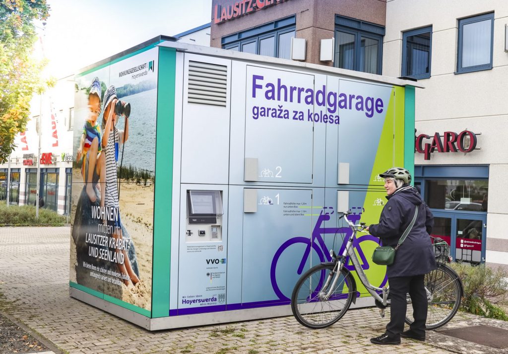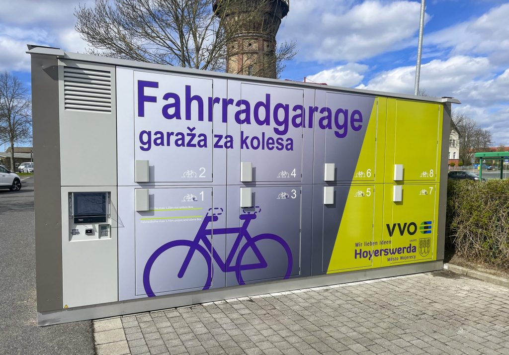 Direkt am Lausitz-Center in Hoyerswerda ist die doppelstöckige Fahrradgarage (Modell Velobrix) der Firma RWC Factory. In 8 Boxen ist Platz für Räder und Gepäck. In den acht unteren Boxen können sogar E-Bikes geladen werden. Die Gebühr (ab 1 Euro) bezahlen Sie mit EC- oder Kreditkarte direkt an der Fahrradbox.