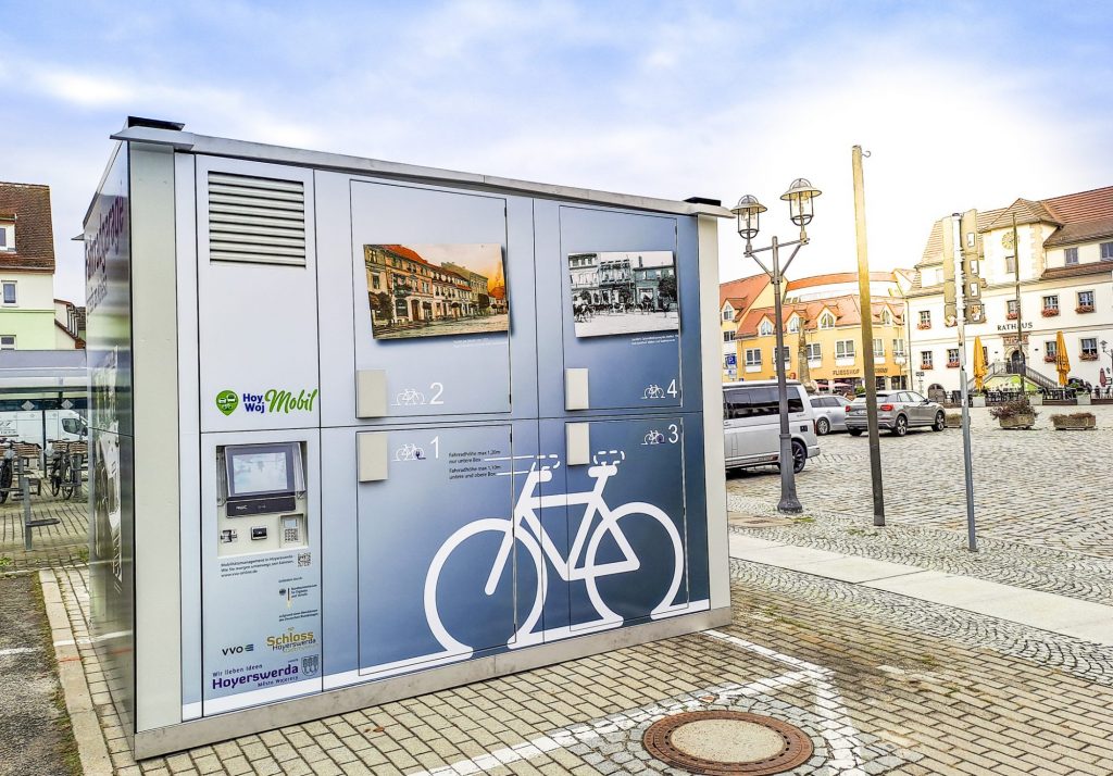 In Hoyerswerda am Markt finden Sie die doppelstöckige Fahrradgarage (Modell Velobrix) der Firma RWC Factory. In 8 Boxen ist Platz für Räder und Gepäck. In den acht unteren Boxen können sogar E-Bikes geladen werden. Die Gebühr (ab 1 Euro) bezahlen Sie mit EC- oder Kreditkarte direkt an der Fahrradbox.
